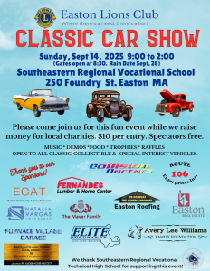 Classic Car Show – Easton Lions Club Please come join us for this fun event while we raise money for local charities. $10 per entry – spectators free! Sunday, Sept 14th 9am – 2pm. (Gates open at 8:30) Rain Date Sept 28th. + Add to Google Calendar + iCal / Outlook export Date Sep 14 2025 Expired! Time 9:00 am - 2:00 pm More Info Read More Location Southeastern Regional Technical High School Parking Lot 250 Foundry St, South Easton, MA 02375 Website https://www.sersd.org/ Share this event