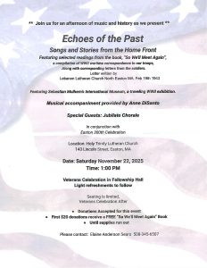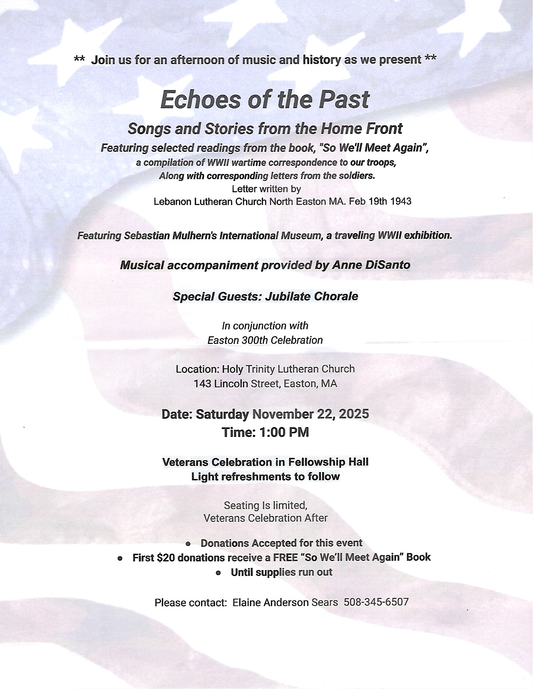 Echoes of the Past Join us for an afternoon of music and history. Echoes of the Past songs and stories from the home front featuring selected readings from the book, “So We’ll Meet Again”. Featuring Sebastian Mulhern’s International Museum, a traveling WWII exhibition + Add to Google Calendar + iCal / Outlook export 00 days 00 hours 00 minutes 00 seconds Date Nov 22 2025 Time 1:00 pm - 1:00 pm More Info Read More Location Holy Trinity Lutheran Church 143 Lincoln St, North Easton, MA 02356 Read More Share this event
